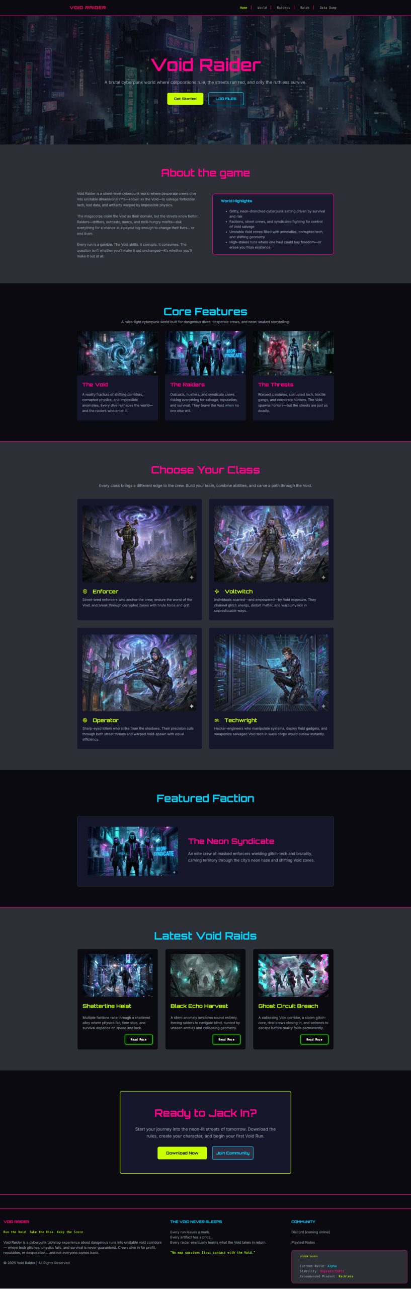 I designed and built the Void Raider website as a fully custom WordPress Full Site Editing (FSE) theme to support an original cyberpunk tabletop game IP. The project was developed from concept through deployment and serves as both a public-facing content platform and a long-term foundation for ongoing world-building, documentation, and community engagement.